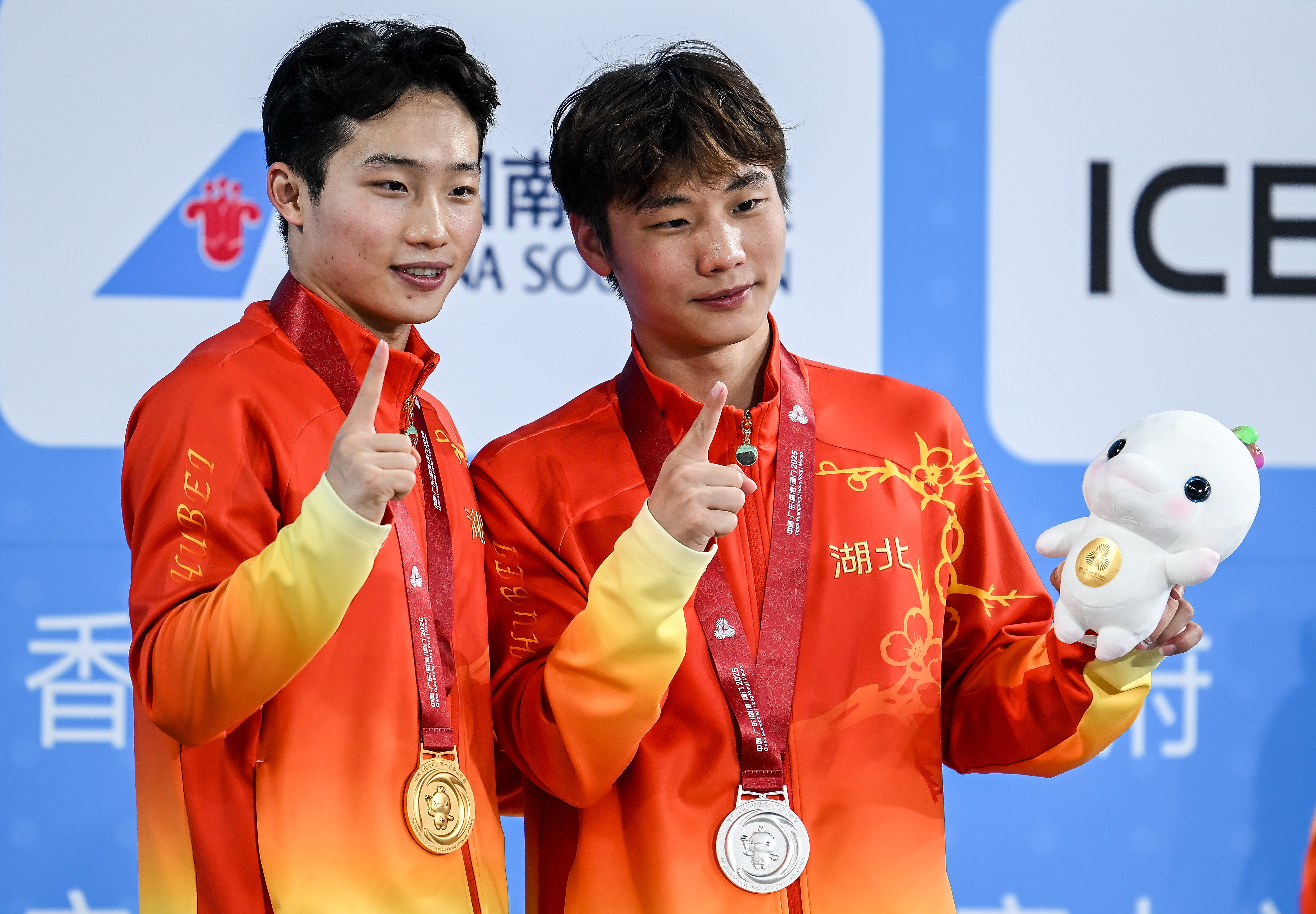 11月10日,获得冠军的湖北队选手王宗源(左)与获得银牌的队友郑九源在颁奖仪式上合影。新华社记者 肖艺九 摄